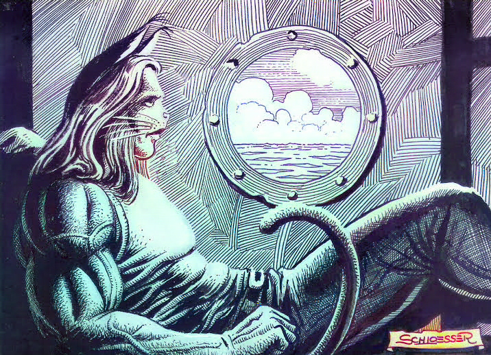 Nos primeiros dois dias deixaram que ficasse sozinho em sua repugnante cabine, mas logo o imediato ordenou que o novo tripulante tivesse companhia. Assim, sem pedir licença, no fim do terceiro dia um enorme porco de couro curtido pelo sol adentrou abruptamente na cabine sem ao menos bater à porta. A audição apurada do felino cinzento já havia escutado de longe os pesados passos do suinoforme e sentido com antecedência o miasma pestilento de seu mau hálito que se tornou quase insuportável quando o resfolegante suídeo penetrou no espaço apertado de ar já viciado daquele local infecto. O porco estava trajado com uma camisa encardida justa que um dia havia sido branca. A mesma continha com dificuldade suas carnes flácidas que pendiam em pregas. Uma calça preta igualmente justa parecia querer se romper principalmente na área anal. Botas pretas de cano longo, salto reforçado e um lenço vermelho amarrado na cabeça completavam a visão dantesca representada por aquela espantosa figura. Preso junto à vasta pança em uma bainha ricamente trabalhada se achava uma ameaçadora adaga de lâmina recurvada. Apesar do clima bizarro da situação, tudo que o felino taciturno sentiu naquele instante foi uma irritação crescente. Amigo da solidão estaria melhor senão fosse obrigado a conviver no mesmo espaço com aquele porco repelente.