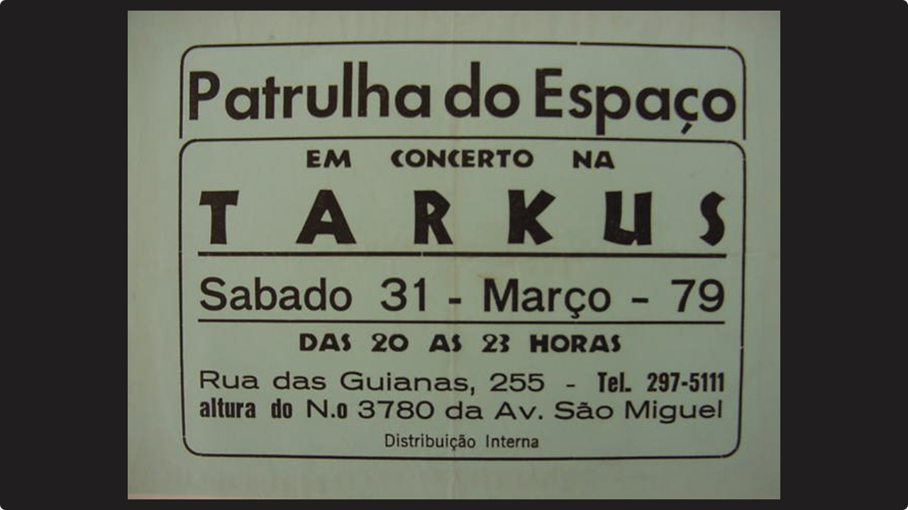 Sai naquela tremenda fossa e fui curtir minha dor de corno num boteco próximo da antiga Rodoviária, afogando minhas mágoas em algumas belas doses de conhaque barato. Quando já me encontrava um tanto, digamos, alcoolizado, lembrei que aconteceria a apresentação da Patrulha do Espaço, que eu não via desde o show do Teatro São Pedro ainda com o Arnaldo, quase um ano antes. Peguei um ônibus e fui direto para a Tarkus, que era uma “Equipe” (Esse é o nome dado na época) que funcionava dentro de uma Sociedade Amigos de Bairro, na Ponte Rasa, Zona Leste, próximo ao bairro onde eu morava.