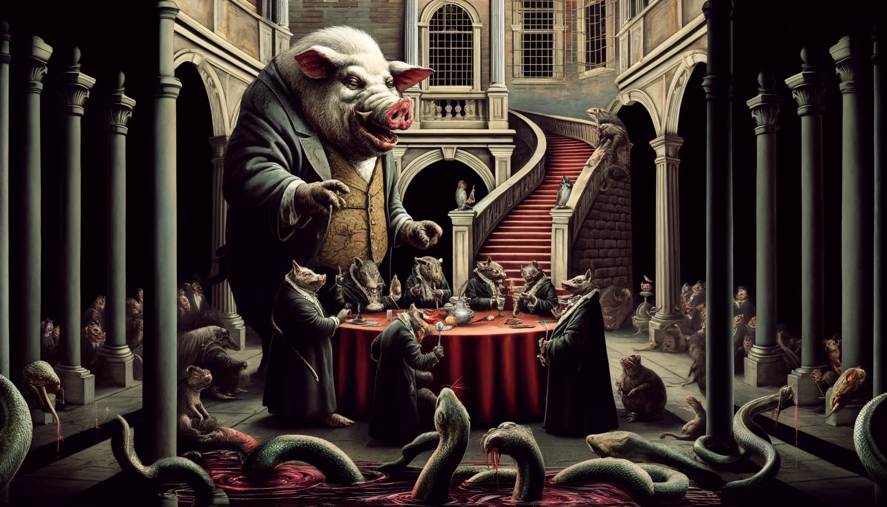 Haverão ainda, ninhos de cobras criadas, vociferando peçonha contra os opositores, sempre disponíveis ao serviço do Rei Porco, para lhe fazerem as oferendas e discursos, para lhe cobrirem a terra de veneno, para traírem a casa, desde que o dinheiro derrame, desde que as costas lhe sejam quentes, desde que se matem os outros, e a carne comida, lhes sirvam aos dentes. Uma cobra jovem, troca de pele, a cada 4 a 6 semanas, já as cobras do reino, valem-se de máscaras e outros itens dos pulhas de origem padrão.