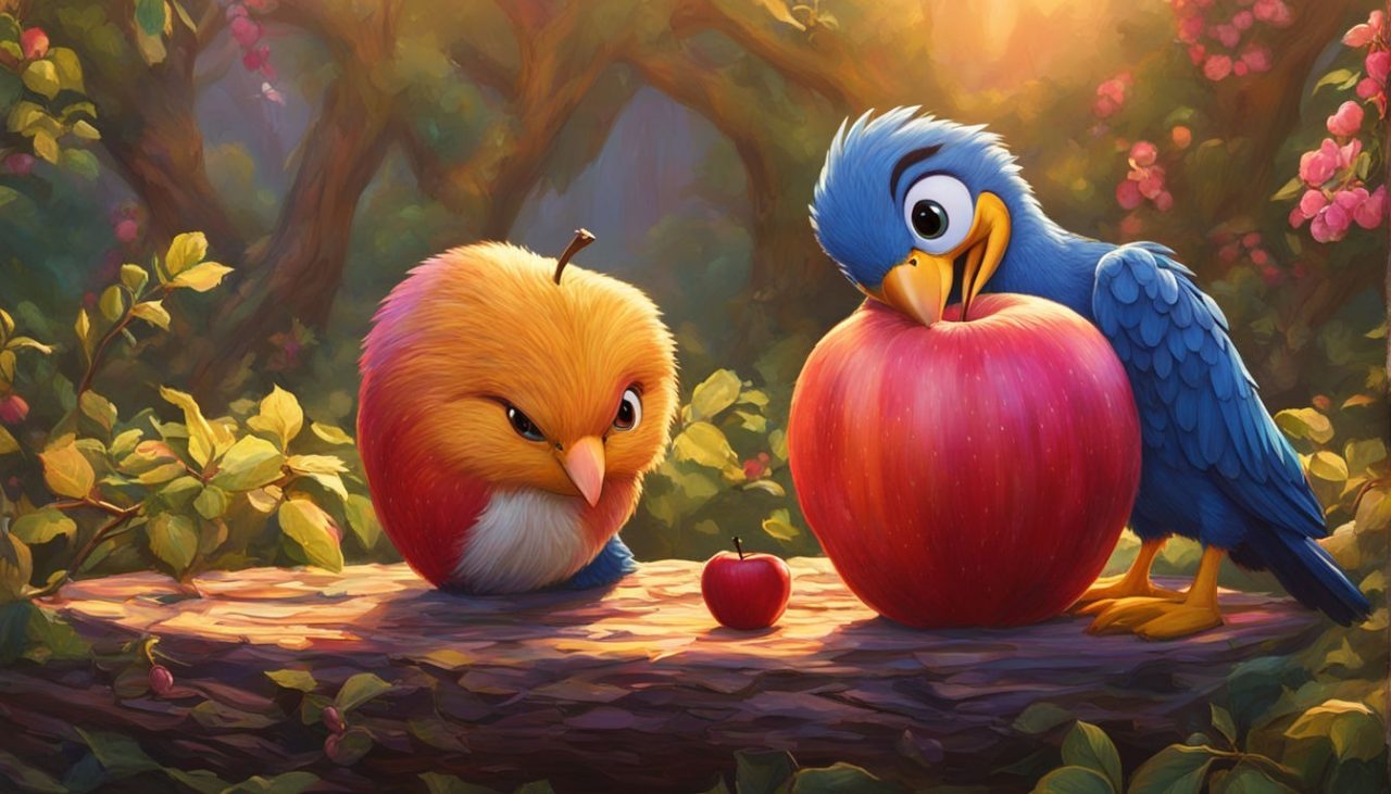 Bico tentou usar suas patas para se libertar, mas a maçã parecia ter um gosto irresistível de comédia. Chiclete o ajudou a sair do buraco e, juntos, eles decidiram compartilhar a maçã gigante. Enquanto Bico se acomodava ao lado de Chiclete, eles começaram a conversar sobre suas aventuras e aprendizados.