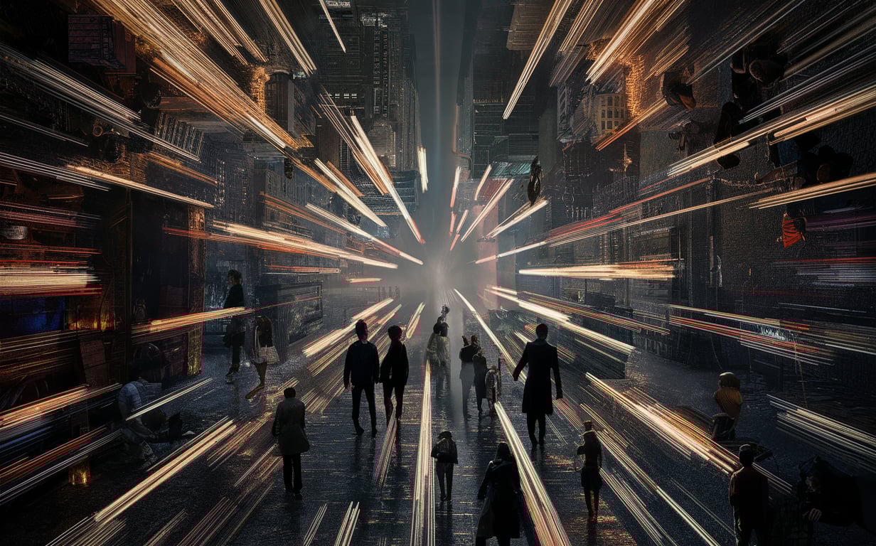 Observo as pessoas ao meu redor, cada uma imersa em seu próprio mundo. Alguns caminham apressados, olhos fixos em dispositivos holográficos, discutindo negócios ou resolvendo problemas que parecem vitais. Outros se permitem um momento de pausa, saboreando um cachorro-quente de uma barraquinha de comida de rua, onde um autômato simpático prepara refeições rápidas e saborosas.