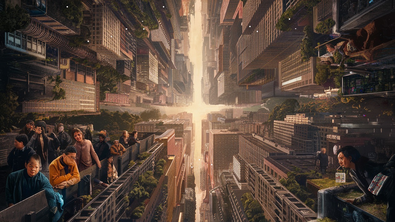 A cidade pulsava com uma energia frenética, um labirinto de concreto e eletricidade que se estendia até onde os olhos podiam ver. Milhões de almas se moviam em sincronia desordenada, preenchendo as ruas esquecidas com uma cacofonia de passos e murmúrios. De cima, a vista era um tapete cinza pontilhado por luzes neon, uma selva urbana que outrora fora uma mata virgem.