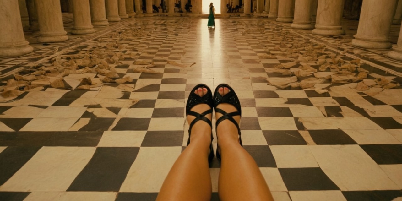 Prosseguiu sua caminhada, sentindo-se como uma peça de xadrez movida por uma mão invisível. Cada passo a levava mais fundo no labirinto de pisos quadriculados, onde as colunas gregas pareciam vigias de uma era esquecida. O eco de suas passadas ressoava pelas vastas galerias, misturando-se ao murmúrio dos pensamentos desordenados que flutuavam ao seu redor.
