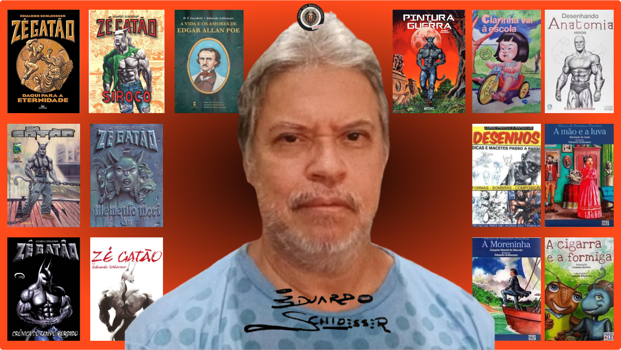 “Eduardo Schloesser é um dos maiores talentos no que diz respeito ao desenho anatômico. Nos anos 1970, inspirado por artistas como Bernie Wrightson e Richard Corben decidiu ingressar num estúdio de desenho para aprimorar sua técnica, e foi agraciado por ter sido orientado pelo Professor Edgar Cognat, que o ensinou a manusear o carvão e o pincel com a mão direita, mantendo a flanela na esquerda a fim de retratar com a maior fidelidade possível, figuras como mãos, pés, narizes e cabeças – moldadas em gesso em tamanho natural. Em 1997, produziu o álbum Zé Gatão – uma graphic novel independente. Tamanha foi sua qualidade, que a Via Lettera a relançou com melhor acabamento gráfico, quatro anos depois. Eduardo continuou colaborando com outras editoras, caso da Escala, emprestando seu traço realista a vários tipos de publicações. De acordo com o autor: “Desenhar é tarefa que requer constância e disciplina. Tenha sempre em mente metas a serem alcançadas!”